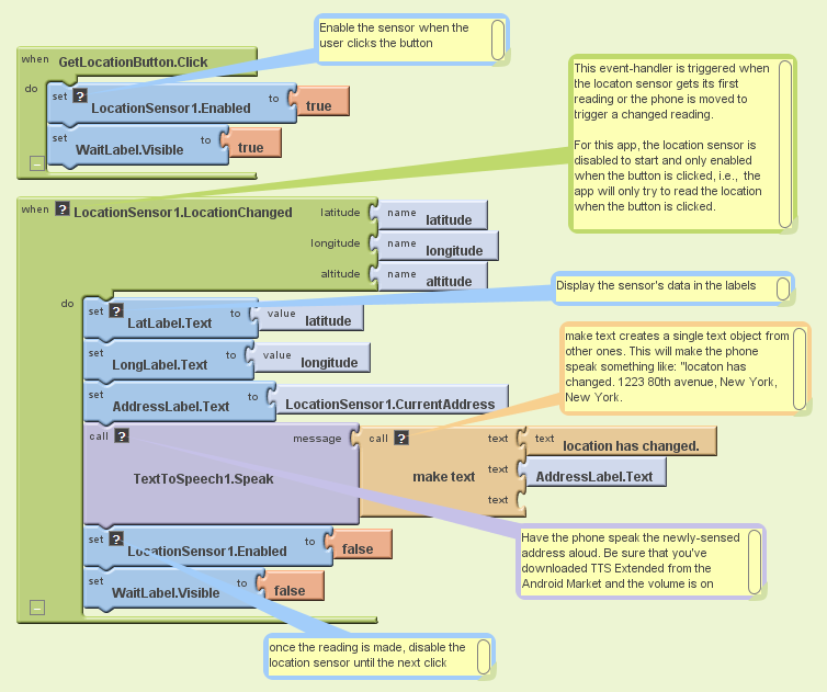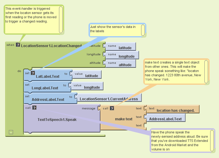 The sample apps below are simple but illustrate the basic way that location can be determined. Both apps report the current latitude, longitude, and addres on the phone's display and, just for fun, speak the address aloud. The first app reports the location as soon as the sensor gets the data and every time the phone's location is changed. The second app only invokes the location sensor in response to an event-- when the user clicks a button.