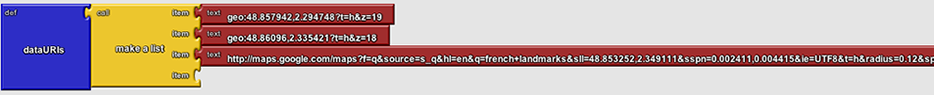 The first two items shown are DataURIs for the Eiffel Tower and the Louvre. They both use the "geo:" prototcol. The third DataURI is not shown completely as the block is too long for this page. You should copy this URL from the entry for "Notre Dame, Street View" in the table above and place it in a text block.