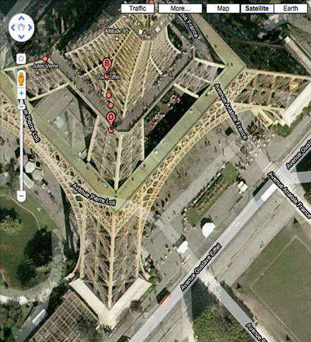 http://maps.google.com/maps?f=q&source=s_q&hl=en&geocode=&q=eiffel+tower&sll=37.0625,-95.677068 &sspn=48.909425,72.333984&ie=UTF8&hq=Tour+Eiffel&hnear=Tour+Eiffel,+Quai+Branly,+75007+Paris,+Ile-de-France,+France&ll=48.857942,2.294748&spn=0.001249,0.002207&t=h&z=19 |